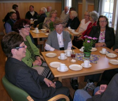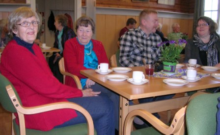 | Praten går ekstra lett over kaffen. Ved det fremste bordet sitter fra høyre: Sigrunn Brusevold, Kai Rød, Synnøve Gundersen, Terje Bergby og Solveig Bergby. På det bakerste bordet fra høyre: Kari S. Lunde, Ingebjørg Skivdal, Iris Kingsrød, Ester Juliussen og Johanne Pahr. |
