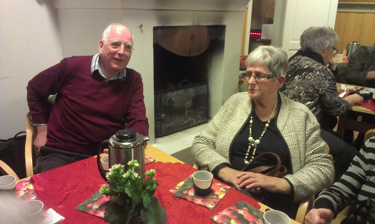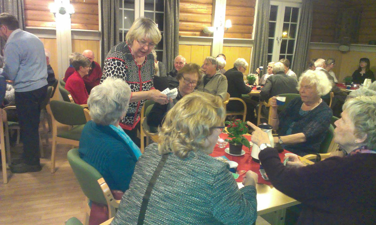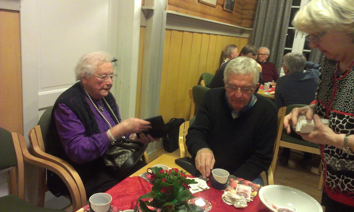 | Astrid Lunde og Jan Henning Hansen kjøper lodd av Sølvi Jelsness. En romslig kaffepause med loddsalg hører alltid med på historielagets møter. |