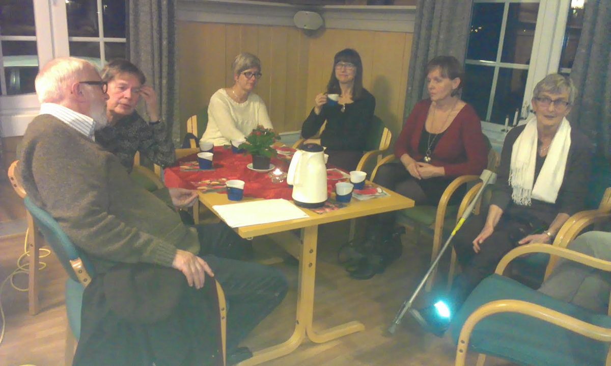 | Fra venstre rundt bordet: Sigrid Hasle, Sylvia Tønnesen, Kjell Andersen, Arild Smaaberg, Tove Wilhelmsen, Elbjørg Bergerud, Jan Hasle og Thorbjørn Olsen. Helt til høyre: Ragnar Berby. |