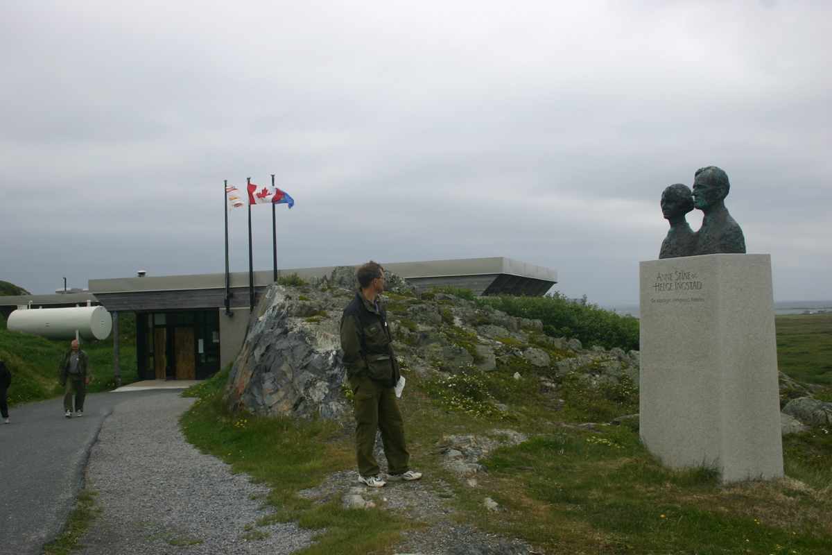 | Kjell Einar Andersen kåserte i julemøtet. Her er han fotografert ved statuen av Helge og Anne Stine Ingstad på Vinland. |