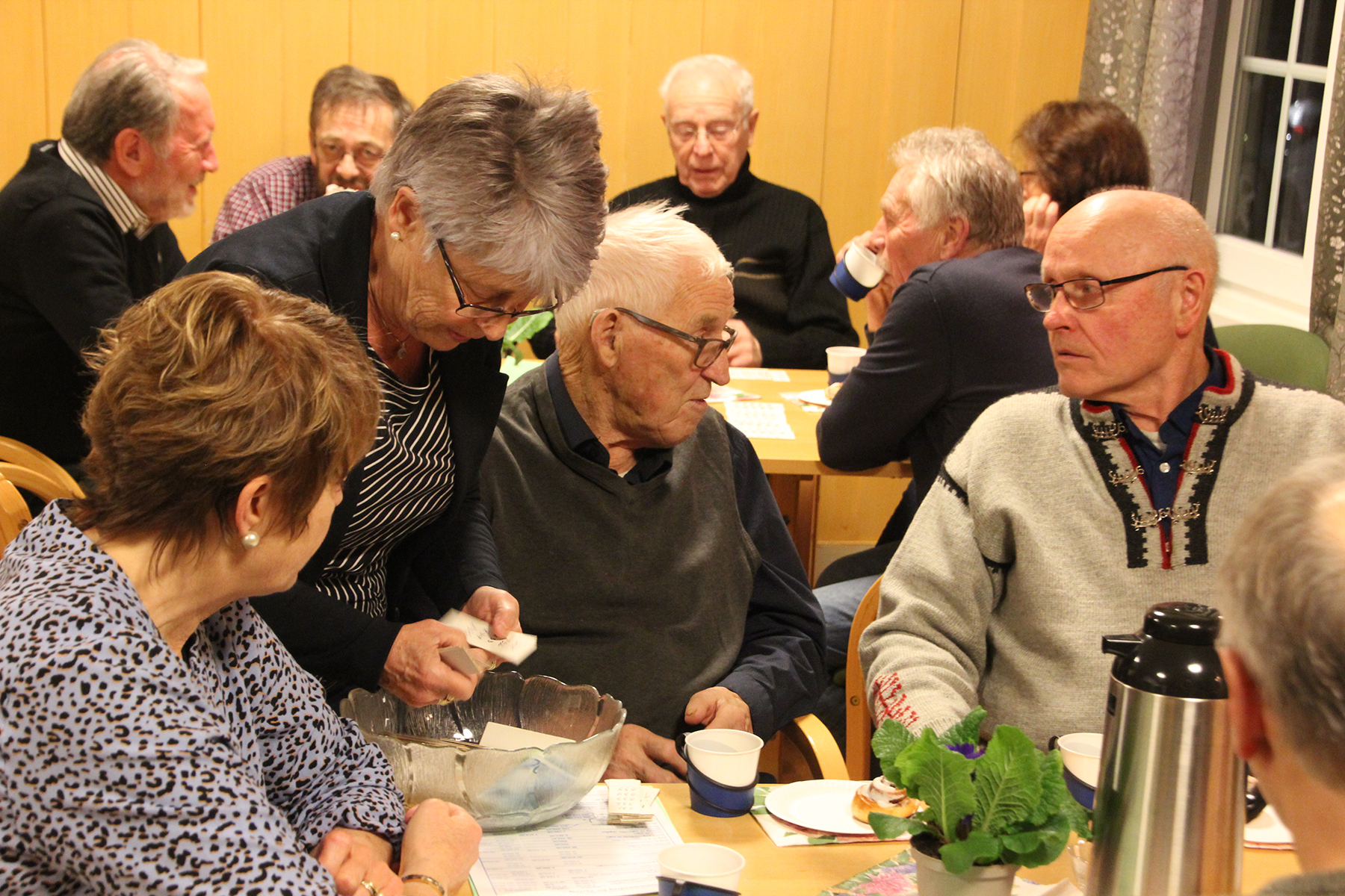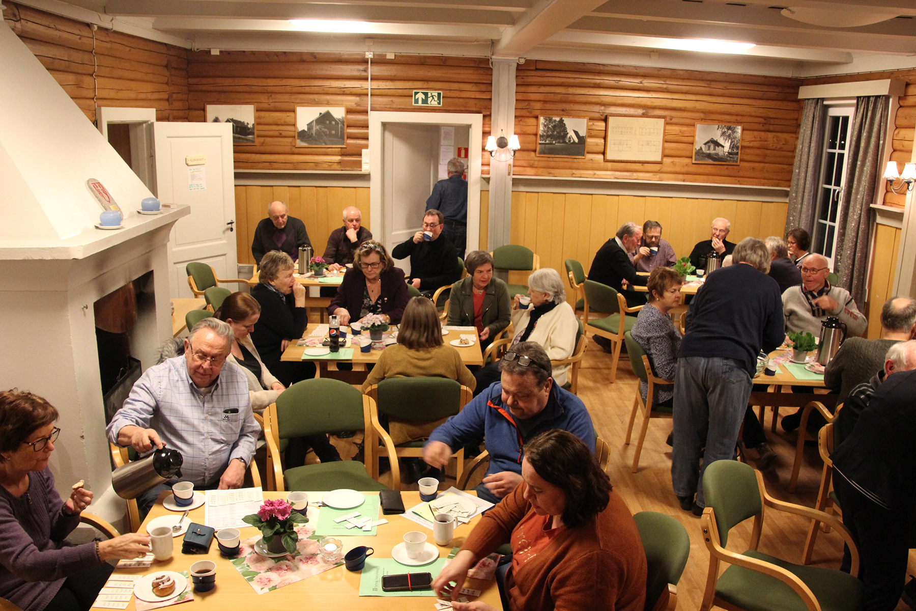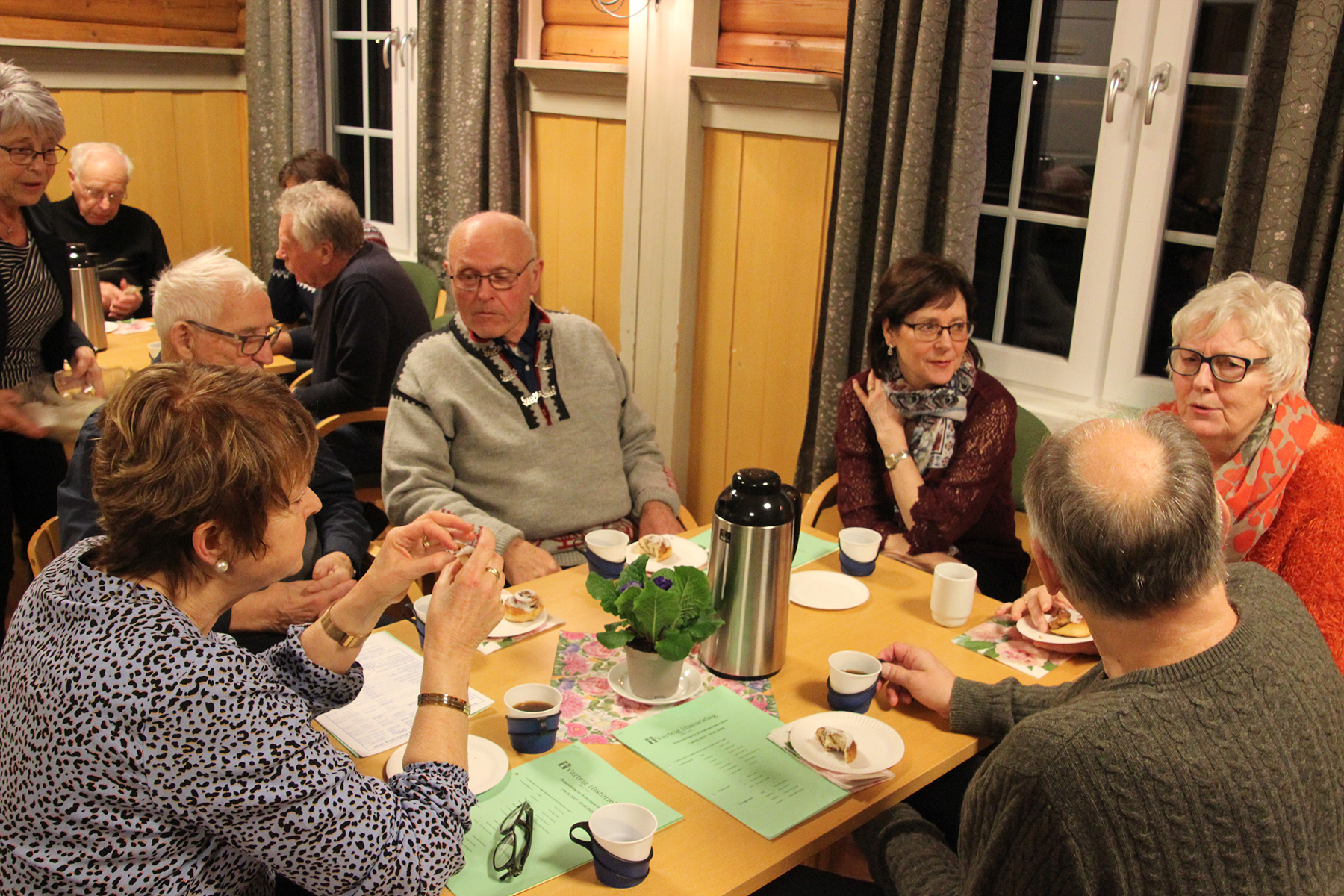 Så inviterte kjøkkenkomiteen på kaffe og hjemmebakte wienerbrød m.m, og praten gikk livlig rundt bordene i peisestua. Det ble solgt lodder, og mange kunne ta med seg en gevinst eller to hjem.