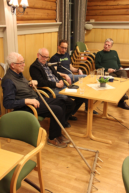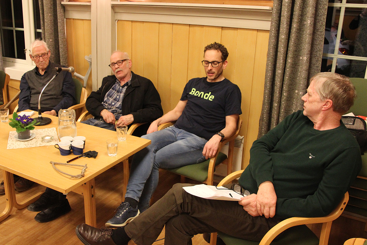| Asmund Brenne, Arne Sigvart Brusevold og Ole Kristian Bergerud samtalte om utviklingen i jordbruket. Ordstyrer var Arnfinn Kullerud. (Alle foto: Kjell Lunde.) |