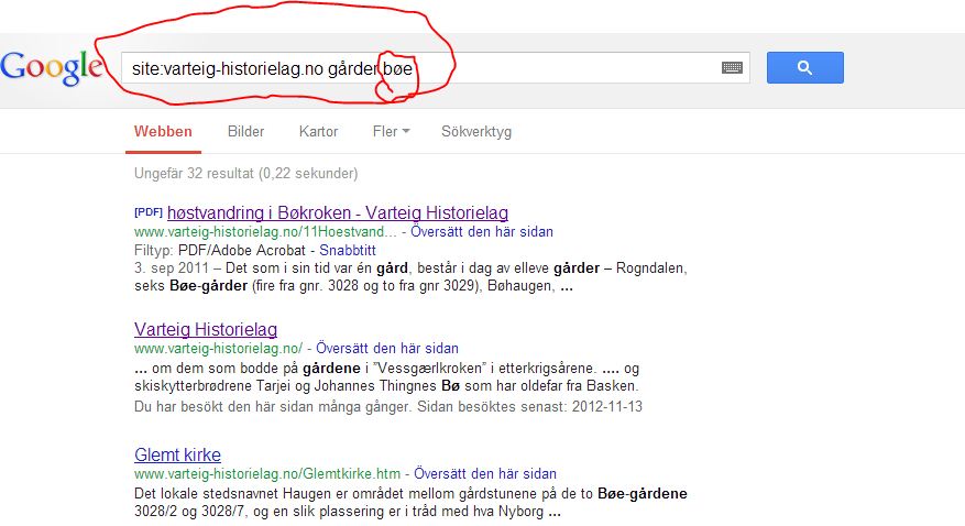 Eksempel, søk på gårder, skriv inn i tillegg Bøe eller annen gårdsnavn. Flere navn er mulig. Google ser ikke forskjell på store og små bokstaver.