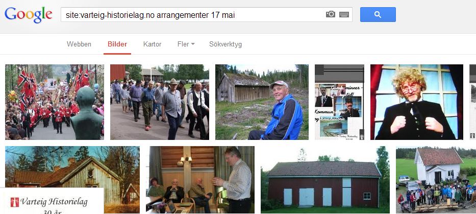 Nedenfor er eksempler på ferdig søk som du kan gjøre i Google på Varteig Historielags side. Klikker du et eksempel, får du opp et nytt vindu. Her ser du i Google's søkevinduet hva søket er og du kan eventuelt endre søket til ditt formål. Se eksempler nedefor som beskriver hvordan du kan snevre inn søket til det du er ute etter når du først er i Google. Eksemplene vil gi deg resultat med fokus på bilder, men du kan enkelt også se resultatene med link til tekster og sider (tradisjonell Googel resultat)ved å klikke Google's Web flik.